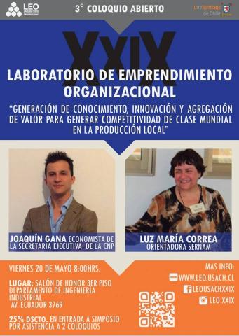 El XXIX Laboratorio de Emprendimiento Organizacional tiene el agrado de invitarles al Tercer Coloquio Abierto 2016:” Generacion de conocimiento, innovacion y agregacion de valor para generar competitividad de clase mundial en la produccion local “. El evento contara con la presencia de Srta. Luz Maria Correa Correa, Orientadora del SERNAM; y Joaquin Gana, Economista de la Secretaria Ejecutiva de la Comision Nacional de Productividad (CNP).